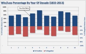 Ahora que ya nos acercamos a fin de año, y que muchos inversores ya tienen el punto de mira en 2015, aprovecho el trayecto en tren para compartir con vosotros un curioso estudio estacional basado en el “patrón de los 10 años”. Este estudio se basa en medir el comportamiento medio del mercado en cada una de las terminaciones anuales, de forma que se extrae el rendimiento medio del mercado para los años terminados en “1” (por ejemplo 1991, 2001,2011 o 1951 entre otros), en “2” (1992, 2002,2012 o 1952 entre otros) y así sucesivamente hasta los años terminados en “0” (1990, 2000, etc…).