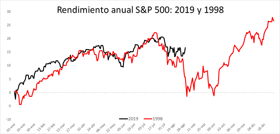 De vez en cuando el mercado nos deja algunas curiosidades que, si bien no tienen ninguna validez operativa, no dejan de ser cuanto menos curiosas. Uno de los aspectos sobre los que más se está hablando en diferentes mesas de operaciones de todo el mundo es la elevadísima correlación que está teniendo el comportamiento del mercado en este año 2019 con lo sucedido en los mercados en el año 1998, y la verdad es que la similitud es mucho más que eso: el mercado de 1998 y el de este 2019 se parecen casi como dos gotas de agua si comparamos los rendimientos de uno frente a otro.