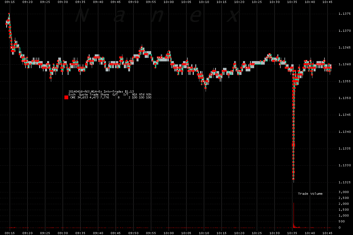 Según informa Nanex, el movimiento se originó a las 16:35:24. En ese momento se vendieron alrededor de 1800 contratos de futuros del Franco Suizo, lo que originó una caída repentina de los precios en 1 segundo. El Franco Suizo necesitó 12 segundos para recuperarse de la venta masiva.