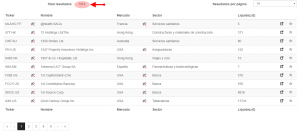 En el listado al lado de estas líneas podéis ver los resultados, en los que se observa tanto el ticker de la compañía como su propio nombre, el sector al que pertenecen, el mercado en el que cotizan y su liquidez para ejecutar órdenes de compra/venta en el mercado. Además, pulsando sobre el icono chart[1] podrás acceder tanto al gráfico del propio valor como de su sector.