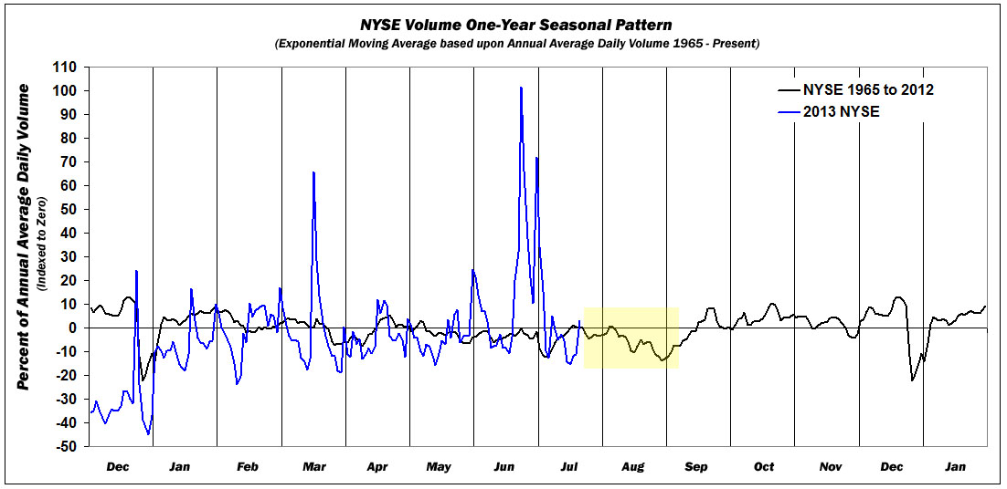 Navegando por la red he encontrado dos interesantes gráficos desarrollados por stocktradersalmanac.com correspondientes al NYSE (datos desde 1965) y al NASDAQ (datos desde 1978) en el que se muestra la estacionalidad del volumen negociado en el transcurso del año.