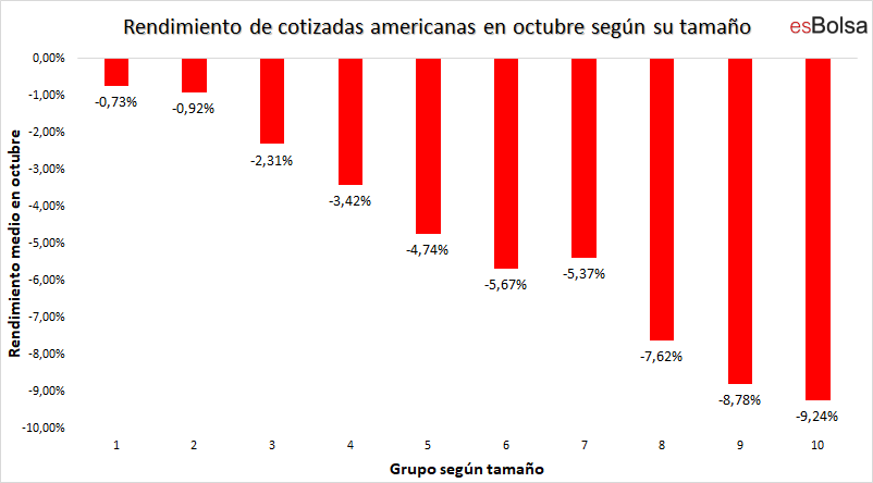 Las 658 acciones más grandes del mercado solo han caído un promedio de 0.73% en octubre, mientras que las 658 acciones más pequeñas han caído un promedio del 9,24%.