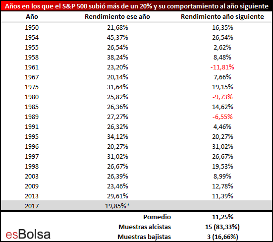 Desde el año 1950 el S&P 500 ha subido un 20% o más en 18 ocasiones. La siguiente tabla refleja todos los precedentes, así como el rendimiento del S&P 500 ese año y el del año siguiente.