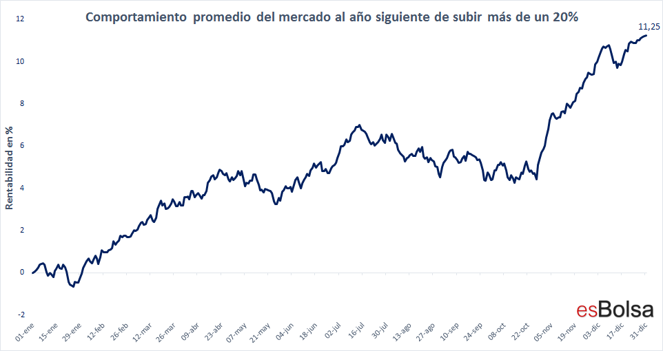 La siguiente gráfica representa el comportamiento promedio experimentado en el transcurso del año siguiente en el que el mercado fue capaz de subir más de un 20%.