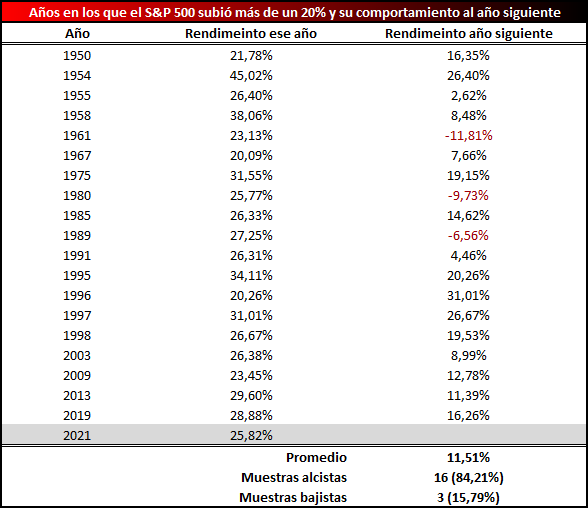 Como se puede observar, el año siguiente a que el S&P 500 acumulase revalorizaciones de más del 20% fue alcista en 16 de los 19 precedentes, lo que significa que en un 84,21% de las ocasiones el mercado cerró con balance positivo el año siguiente a acumular una revalorización de más del 20%.