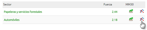 representa que el sector al que hace referencia se encuentra en tendencia bajista. El listado está ordenado por fortaleza RscMansfield, es decir, los sectores se ordenarán de más fuertes (mejor lo hacen) hasta más débiles (los que peor lo hacen).