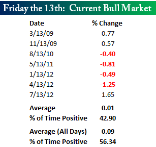 La tabla superior muestra los siete días de este ciclo alcista que han coincidido en viernes 13. El S&P 500 ha promediado una ganancia del 0,01% subiendo sólo tres de los siete días “malditos”. Si hacemos una comparación, la variación media del S&P 500 teniendo en cuenta todos los días hábiles de este mercado alcista ha sido del +0.09 cerrando en positivo el 56,3% de las veces, con lo que estadísticamente los viernes 13 suelen ser jornadas peores que la media.