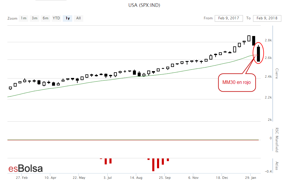 La media móvil de 30 semanas del mercado americano (índice de referencia S&P 500) podría cerrar esta semana en un nivel inferior al de la semana anterior, esto significa que caso de confirmarse el mercado americano perdería a cierre semanal su sesgo alcista de medio plazo.