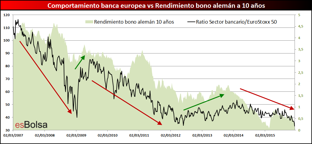 Tal y como vimos en el artículo “Esta es la clave del mal comportamiento de la banca europea en los mercados”, existe una correlación muy alta entre el comportamiento de la banca en los mercados y los rendimientos de los bonos soberanos.