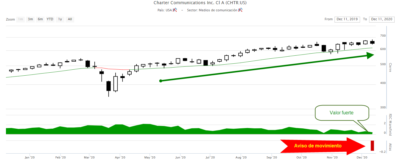 La segunda parada en este viaje por el mercado estadounidense la haremos en el sector de medios de comunicación (uno de los sectores con mejor comportamiento ahora mismo en EEUU), y más concretamente en la empresa Charter Communications Inc , valor que esta semana ha activado las señales de nuestros rastreadores.