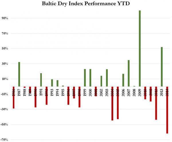 En la siguiente tabla de zerohedge podéis ver cómo el Baltic Dry Index está sufriendo su peor inicio de año desde que comenzaron los registros hace 30 años, habiendo perdido más de la mitad de su cotización en estos primeros 6 meses del año.