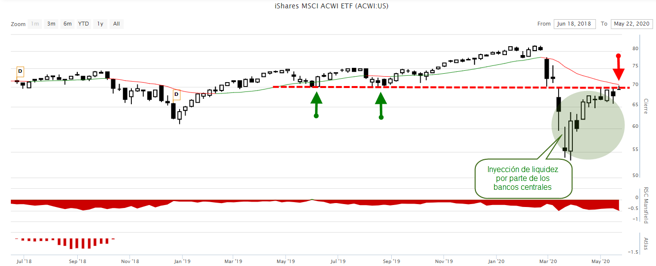 Hoy me gustaría hacer una revisión a la situación desde un punto de vista más global, compartiendo con vosotros un análisis del ETF iShares MSCI ACWI ya que este índice se encuentra en un punto que merece nuestra atención. Este ETF está compuesto por las principales empresas de 23 países desarrollados y 24 países emergentes, cubriendo por tanto la inmensa mayoría del mercado de valores mundial. Esta circunstancia hace que este ETF sea una buena referencia para analizar en un mismo gráfico lo que está sucediendo en las bolsas de valores mundiales con dividendos incluidos.