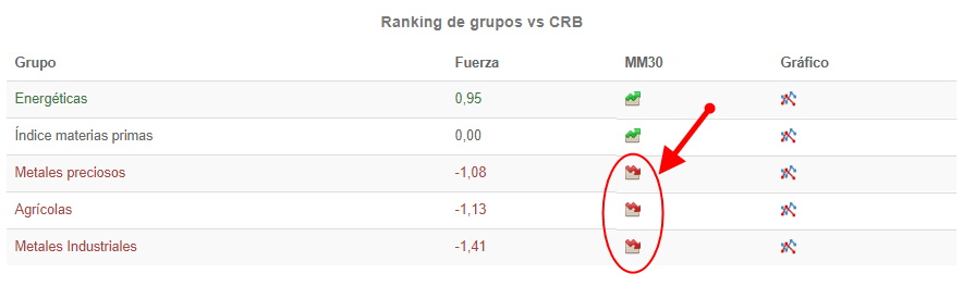 representa que el grupo o materia prima a la que se hace referencia está en tendencia alcista mientras que el icono con la flecha roja
