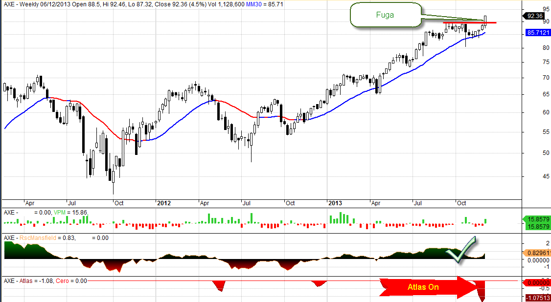 A pesar de que la semana pasada fue globalmente bajista, los mercados más fuertes como el americano siguen presentando fugas con buen aspecto. Una de ellas es Anixter, perteneciente al sector electrónico (uno de los destacados el pasado sábado). El valor sigue alcista y fuerte, es decir, es uno de esos valores que siguen subiendo a mayor ritmo que la media del mercado. La semana pasada era capaz de romper resistencias con fuerza y como consecuencia reanuda su subida libre, es decir, estamos hablando de un valor ganador que avanza sin resistencias, con lo que es muy probable que siga avanzando de forma sostenida, e incuso a gran velocidad tal y como indica el Atlas.