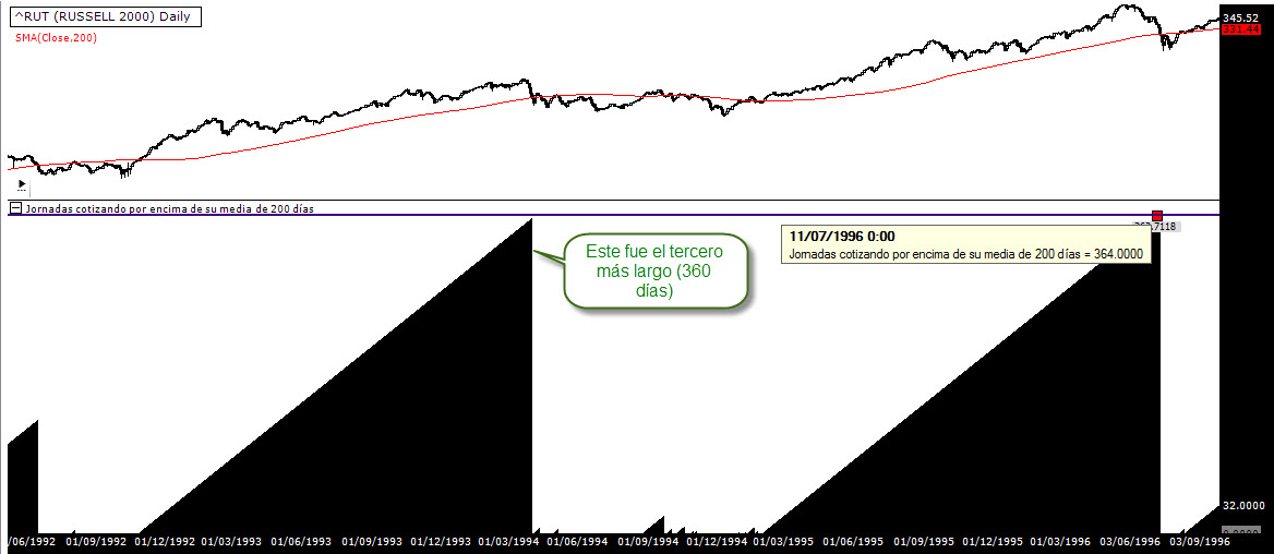 Dos años antes, entre 1993 y 1994 se sitúa el que ahora es el tercer rally más largo de la historia del Russell 2000 por encima de su media de 200 jornadas. En aquel momento el índice alcanzó 360 días de cierres por encima de su promedio, y después de su pérdida el índice retrocedió un 5,43% adicional antes de reanudar las alzas.