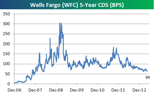 En la jornada de ayer veíamos que el sector bancario (perteneciente al grupo de finanzas) se apuntaba al buen tono, y hoy gracias a los gráficos de los compañeros de Bespokeinvest veremos cómo esta mejora viene acompañada por una gran caída en el precio de los seguros de incumplimiento de pagos en el sector (también conocidos como CDS, siglas de Credit Default Swap). Los gráficos que veremos a continuación representan los CDS a 5 años (en puntos básicos) de los seis mayores bancos de EE.UU.