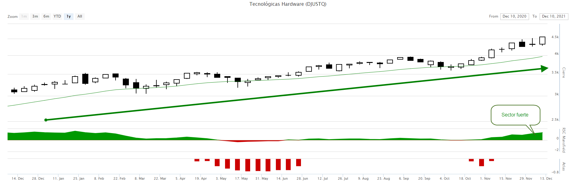 En la jornada de hoy, hablaremos de este sector que estamos siguiendo muy de cerca desde hace semanas. De hecho, el pasado 23 de noviembre, en la cartera modelo de esBolsa tomamos posiciones en Apple, uno de los gigantes del hardware, puesto que es un sector favorable para las inversiones, ahora mismo, por su buen comportamiento.