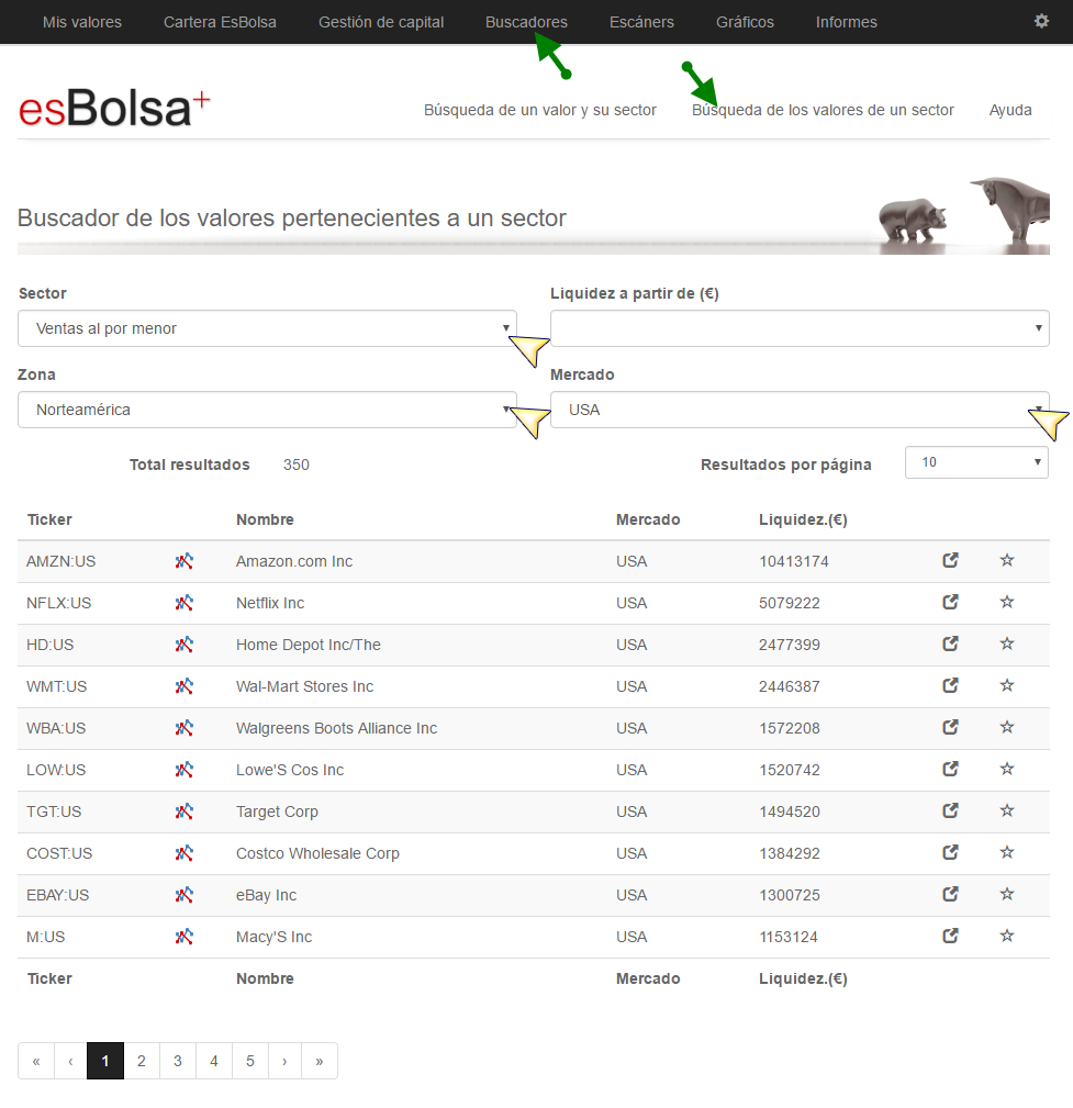 Os dejo a continuación el listado de los 10 valores más líquidos del sector de ventas al por menor en EEUU. Recordad que los datos completos los podéis encontrar en la herramienta de información sectorial de esBolsa.com.