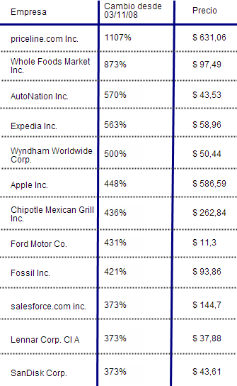 Os dejo a continuación el listado con los mejores valores del S&P 500 desde que Obama fuese elegido presidente.