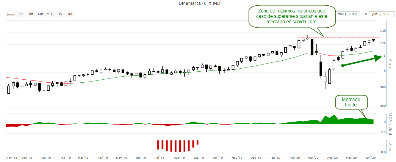 Tan solo existe un gran mercado en Europa capaz de superar en aspecto técnico a los mercados americanos. La bolsa de Dinamarca poco a poco y sin hacer apenas ruido está a las puertas de la subida libre, es decir, es un mercado que opera cerca de máximos históricos, y que, caso de lograr superarlos pasaría a avanzar sin resistencias que obstaculicen su marcado sesgo alcista.