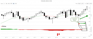 El indicador RSCMansfield que mide el desempeño relativo del índice, nos dice que desde julio de 2017 la bolsa finlandesa era débil, es decir, este mercado del norte de Europa iba a “remolque” de otras bolsas internacionales más fuertes.