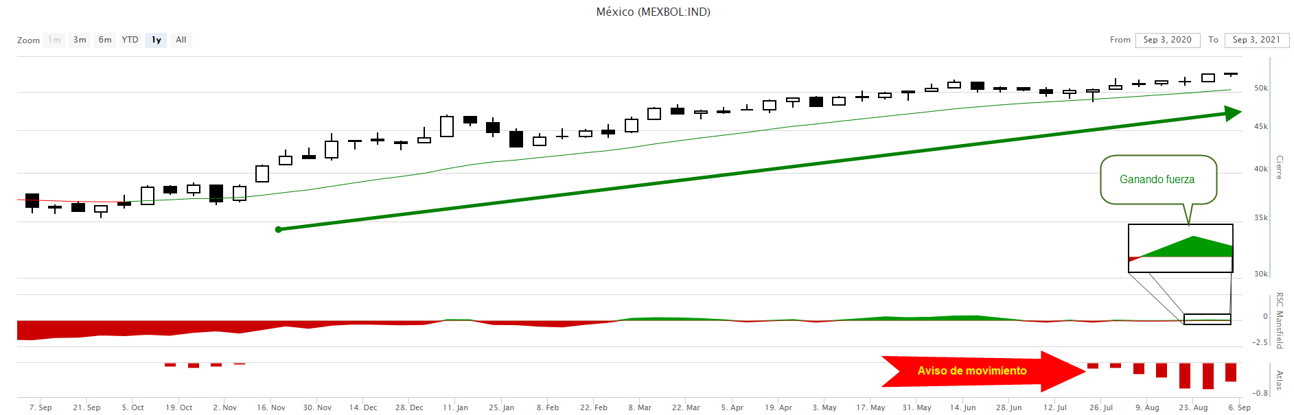 Recordemos que, en activos que son fuertes y alcistas (como es el caso de la bolsa de México), cuando el indicador Atlas está encendido lo más probable es que el movimiento alertado por el Atlas se produzca al alza. La superación de máximos por parte del índice mexicano estas últimas semanas ha sido la confirmación de que la bolsa mexicana vuelve a subir libre. Una pérdida del soporte de los 49.785 puntos ( punto por el que pasaba la MM30 cuando el índice mexicano hizo su último mínimo a precios de cierre la semana del 20 de agosto de 2021) sería el nivel que anularía el escenario alcista para el mercado de valores de México.