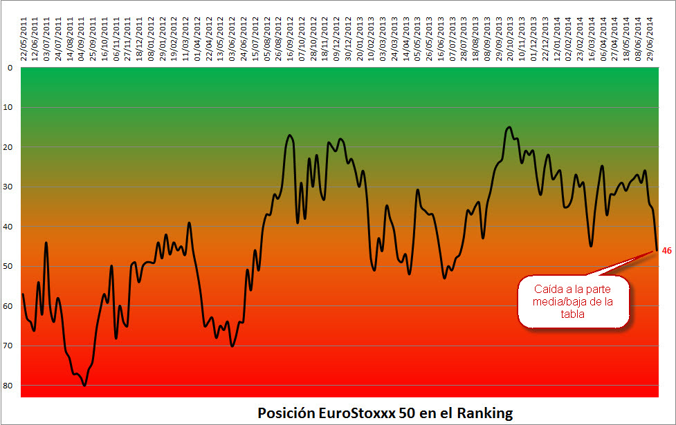 Para ver el deterioro progresivo de las bolsas europeas, prestad atención al siguiente gráfico. En él podéis ver una línea que representa la situación del EuroStoxx 50 dentro de nuestro ranking mundial durante los últimos años. Cuanto más arriba está el índice, mejor, ya que significa que está más fuerte. En cambio, un índice situado en la parte baja de la tabla significa que está débil, o lo que es lo mismo, que lo hace mucho peor que el resto de mercados.