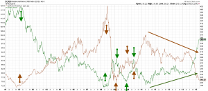 He señalado los cambios de rumbo en ambos activos con flechas y vemos que la relación inversa se cumple casi de forma milimétrica (salvo ocasiones puntuales) y los desfases entre los movimientos de un producto y otro son más bien pequeños, llegando a ser prácticamente nulos en un 80% de las ocasiones.