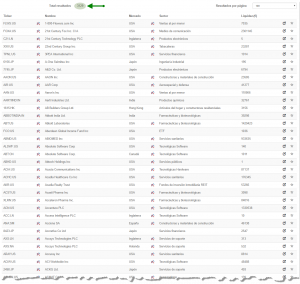 En el listado al lado de estas líneas podéis ver los resultados, en los que se observa tanto el ticker de la compañía como su propio nombre, el sector al que pertenecen, el mercado en el que cotizan y su liquidez para ejecutar órdenes de compra/venta en el mercado. Además, pulsando sobre el icono