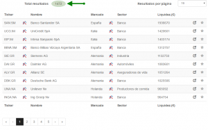 En el listado al lado de estas líneas podéis ver los 10 primeros resultados, en los que se observa tanto el ticker de la compañía como su propio nombre, el sector al que pertenecen y su capitalización. Además, pulsando sobre el icono chart[1] podrás acceder tanto al gráfico del propio valor como de su sector. Me he tomado la libertad de ordenar los resultados por orden de liquidez en el mercado de cada uno de los valores, para que podáis visualizar los resultados por orden de tamaño de las compañías.