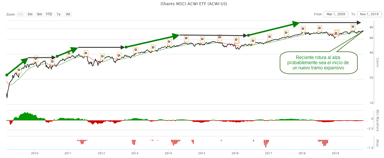 Como ya he comentado en alguna ocasión, estos comportamientos laterales, lejos de ser algo inusual, son algo natural. A lo largo de un ciclo alcista, los mercados alternan episodios de fuerte tendencia, con episodios de descanso o consolidación. Esto lo podemos ver más claramente en la siguiente imagen que representa con flechas verdes los episodios tendenciales y con flechas negras los episodios de consolidación, en la última década, dentro de la renta variable mundial.