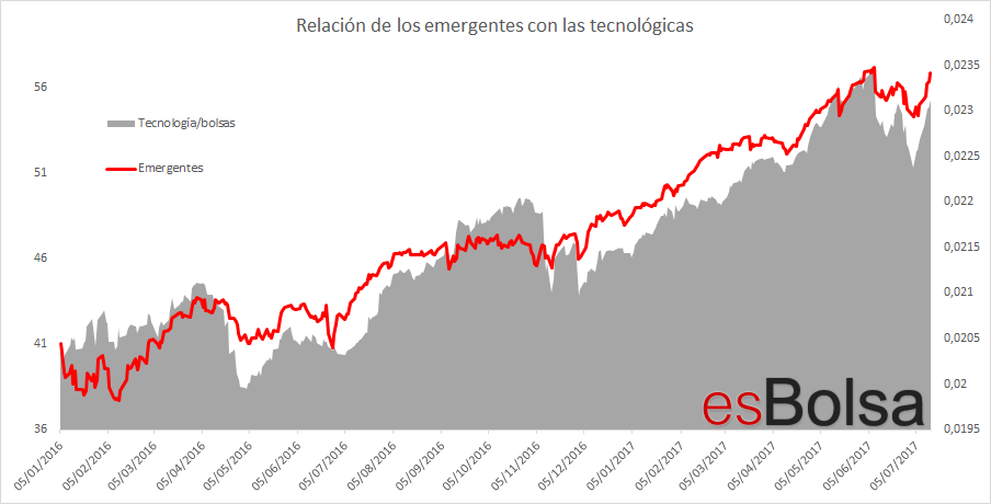 El siguiente gráfico muestra una estrecha correlación entre los mercados emergentes (línea roja) y la relación que resulta de dividir el comportamiento de las acciones tecnológicas de todo el mundo entre el promedio de bolsas mundiales. Si el área gris asciende significa que las acciones tecnológicas del mundo tienden a hacerlo mejor que las bolas. Por contra, si el área gris cae, significa que las acciones tecnológicas del mundo tienden a hacerlo peor que el promedio de bolsas mundiales.