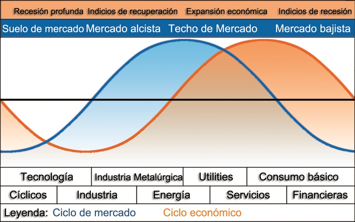En la siguiente imagen extraída del libro, la línea naranja corresponde al ciclo económico, mientras que la azul refleja a los mercados bursátiles. En la parte inferior se observa qué industrias suelen ser las ganadoras en cada parte del ciclo.