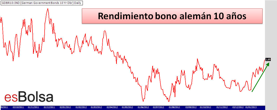 Ahora que ya entendemos que en el diferencial de deuda intervienen dos factores, debemos saber que mientras los diferenciales se han reducido como hemos visto anteriormente, lo cierto es que los rendimientos reales de los bonos periféricos no han bajado tanto, y menos desde principios de este año. Esto se debe a que los rendimientos de deuda alemana a 10 años están aumentando con fuerza desde que empezase este 2013 y actualmente se encuentran en un nivel del 1,69%, lo que supone una subida del 28% desde el 1 de enero cuando cotizaba en el 1,32%.