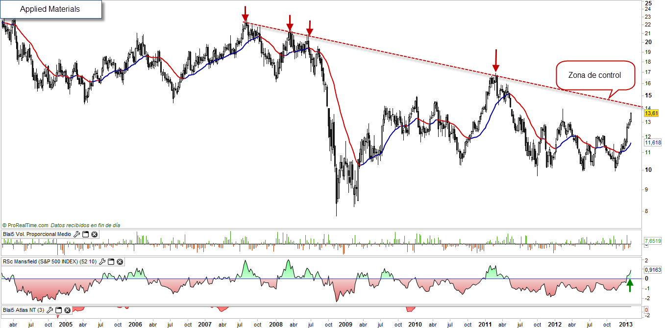 Este gráfico presenta mucho mejor aspecto, el sector acompaña y la subida libre está servida si el valor rebota. El stop estaría bajo el soporte señalado en la imágen