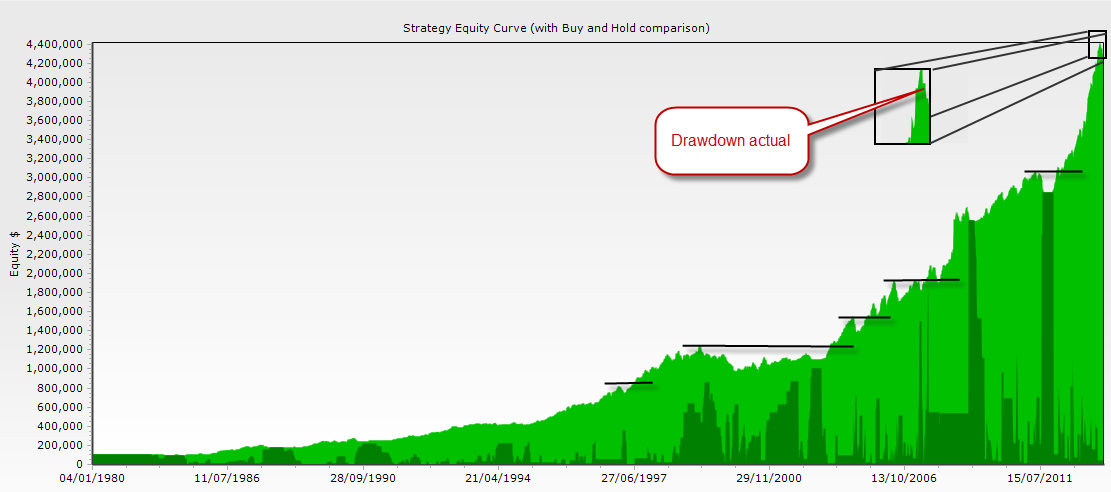 En primer lugar, vamos a ver la curva de beneficios del sistema desde el año 1980. Sobre ella os he señalado algunos episodios de drawdown con una línea negra y he ampliado el drawdown actual.
