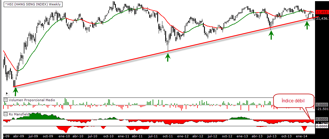 Hong Kong es otro de esos mercados que refleja la debilidad de los emergentes. Entre los años 2005 y 2007 este mercado fue un auténtico yacimiento de oportunidades de inversión, ya que en aquellos años subía a mayor ritmo que la media, pero en el mercado alcista iniciado en 2009 a nivel global, Hong Kong apenas ha logrado ser interesante en 2009 y algún momento puntual a finales de 2012.