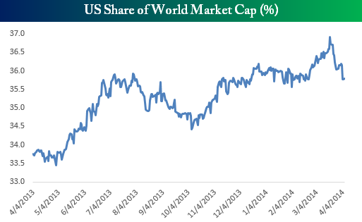 El pasado domingo vimos la pérdida de fuerza relativa que estaba experimentando la renta variable americana. Esto está viéndose también reflejado en el peso que tiene la capitalización bursátil americana con respecto a la capitalización bursátil mundial. El siguiente gráfico generado por Bespokeinvest muestra el “peso” que tiene la renta variable norteamericana en lo que a capitalización se refiere con respecto a la renta variable mundial en el último año.
