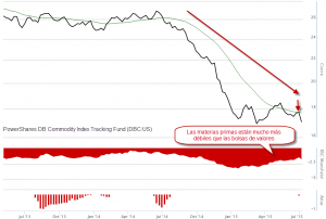 Esto se aprecia más claramente en el análisis estrictamente técnico de las materias primas, al lado de estas líneas podéis ver el gráfico del ETF PowerShares DB Commodity Index Tracking Fund. A pesar de que en las últimas semanas se ha frenado la velocidad de la caída en la cotización de las materias primas (propiciado por un respiro en las alzas del Dólar), el “mix” de commodities se mantiene en clara tendencia bajista, lo que refleja el sufrimiento de estos productos.