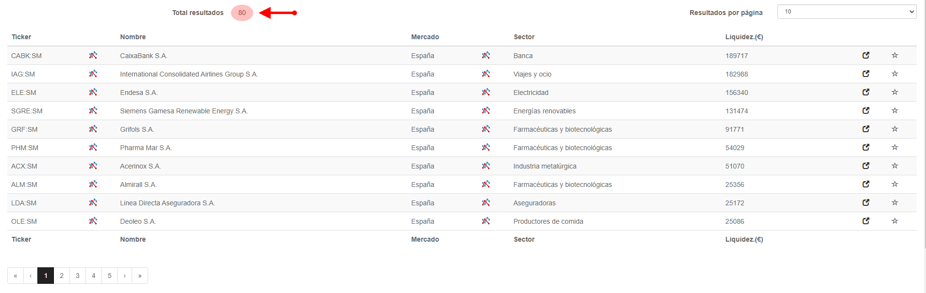 En el listado al lado de estas líneas podéis ver los 10 primeros resultados, en los que se observa tanto el ticker de la compañía como su propio nombre, el sector al que pertenecen y su liquidez en el mercado. Además, pulsando sobre el icono