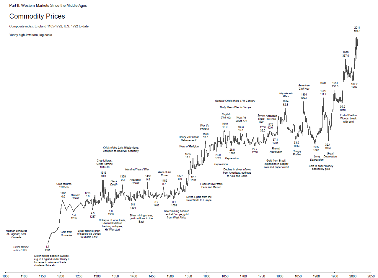 En la jornada de ayer repasamos la evolución de los precios de los principales activos en los últimos 240 años de historia del mercado americano. No obstante, tal vez algunos todavía no estéis del todo satisfechos con “sólo” 240 años. Es por ello que con el fin de obtener una perspectiva verdadera de largo plazo, nos remontaremos 1000 años atrás, es decir, hasta la Edad Media, para ver cómo los precios de las acciones, los tipos de interés, los precios de las materias primas y el oro han cambiado en estos últimos mil años (y sobre todo cómo los acontecimientos históricos han influido en los cambios de los precios).