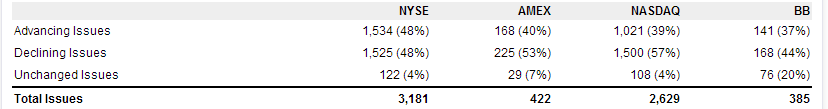 Si hacemos la suma de todos los mercados nos damos cuenta como en conjunto, ahora mismo en Estados Unidos cotizan 6617 valores, de los cuales 2864 avanzaron, 3418 bajaron y 335 terminaron en tablas.