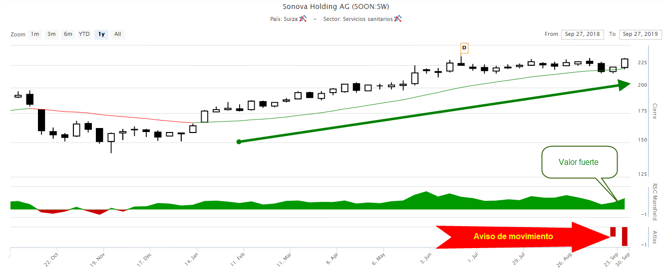 Además de esto, el Atlas ya nos avisa de que se espera un movimiento violento sobre la cotizada, que, dado el aspecto positivo tanto del mercado suizo, como del sector y el propio valor, lo más probable es que se produzca al alza una vez el valor ya ha sido capaz de superar máximos (232,80CHF).