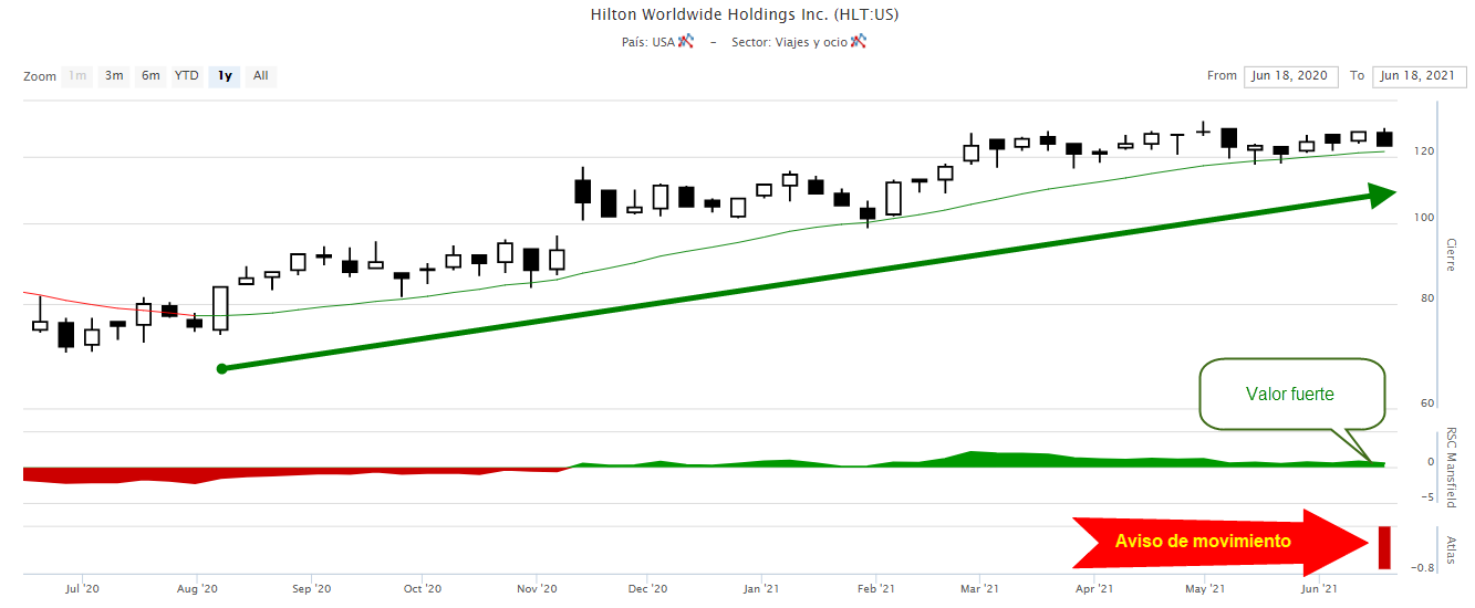 La segunda parada la haremos en el mercado estadounidense, concretamente en el sector viajes y ocio (uno de los sectores con mejor comportamiento ahora mismo en Norteamérica), más concretamente en Hilton Worldwide Holdings Inc, valor que está a un paso de establecer nuevos máximos históricos y que no ha pasado desapercibido para nuestros radares.