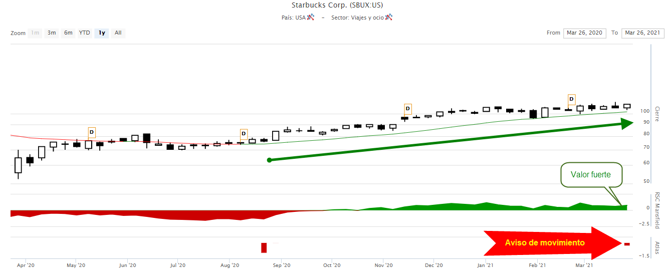 Empezamos nuestro análisis por el sector viajes y ocio norteamericano, concretamente en el valor Starbucks Corp que esta semana ha activado las señales de nuestros rastreadores.